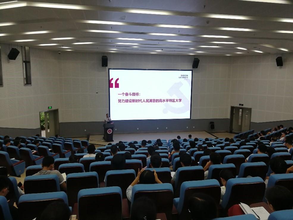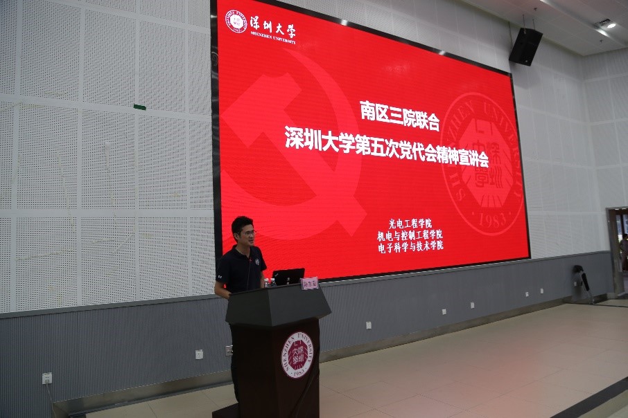 为进一步学习贯彻落实深圳大学第五次党代会精神,2018年10月10日下午,深圳大学校党委常委、党委宣传部部长陈家喜教授受邀在电子科学与技术学院报告厅,为光电工程学院、机电与控制工程学院和电子科学与技术学院的师生做了一场全面透彻的深圳大学第五次党代会宣讲报告。宣讲会由电子科学与技术学院党委副书记林济霖主持,三院师生共350余人聆听了此次宣讲。