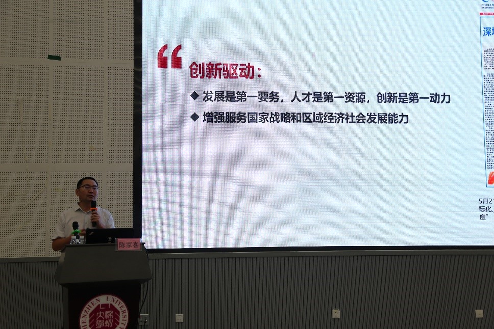 陈家喜教授首先介绍了深圳大学第五次党代会报告的构成,结合习近平新时代中国特色社会主义思想和《深圳大学文化创新发展纲要》,介绍深圳大学过去五年取得的优秀成果,简述了时代背景下深圳大学面临的新时期挑战,阐释了新时代深圳大学的使命和担当,阐述新时期新阶段的一个奋斗目标、三个新理念、四个新使命、五个“走在全国前列”、未来发展的十大举措,深入传达学校第五次党代会精神,提醒师生们要时刻要时刻铭记自立自律自强的校训精神,为建设新时代人民满意的高水平特区大学而脚踏实地。