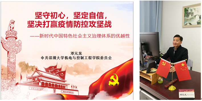 2020年4月7日,机电与控制工程学院2020年春季学期“思政第一课”云端开讲。学院党委书记邓元龙教授以《坚守初心,坚定自信,坚决打赢疫情防控攻坚战——新时代中国特色社会主义治理体系的优越性》为题,在线给学院180名入党积极分子上了一堂生动的“思政第一课”。