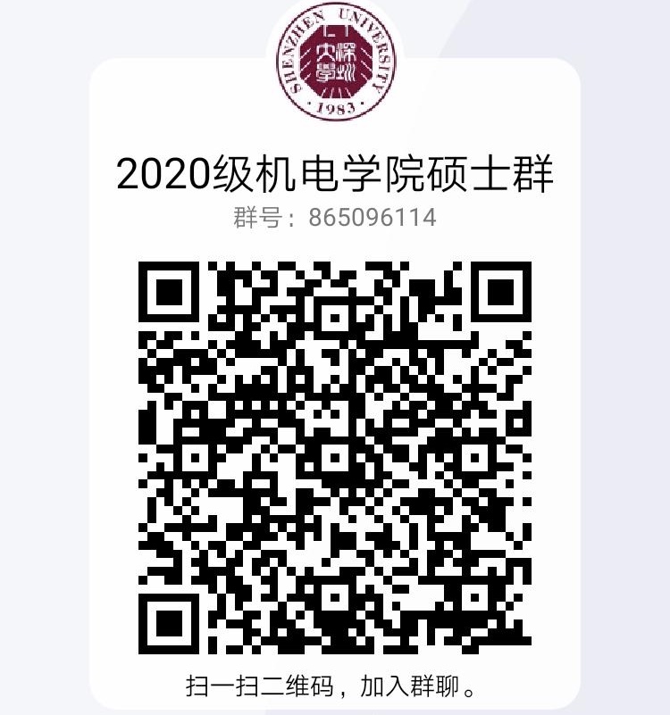 请深圳大学机电与控制工程学院机械工程080200、机械085500、控制科学与工程081100、电子信息085400、交通运输086100五个专业的拟录取考生,务必尽快加入学院的2020级硕士QQ群,方便后续工作的通知及安排。为保障各位同学的信息安全,加群申请务必填写本人姓名、报考专业名词和报考时填写的手机号三项信息,否则不予通过。QQ群号及二维码如下: