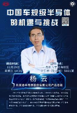 12月29日下午,比亚迪半导体股份有限公司副总经理杨云在深圳大学机电与控制工程学院S601会议室举行了题为“中国车规级半导体的机遇与挑战”的前沿技术讲座。深圳大学微电子研究院副院长郭登极主持,机电与控制工程学院副院长龚峰、电子与信息工程学院副院长黎冰出席并致辞,近50名在校研究生本科生认真听取了本次讲座。