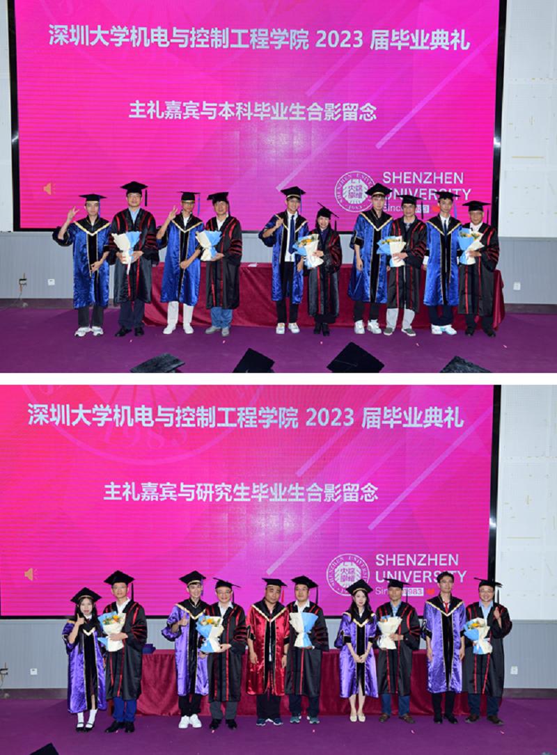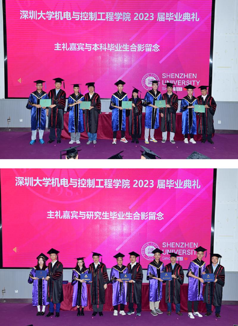 “三自四秩,逐梦一流”,2023年是深圳大学的不惑之年,在这个荔枝满园的特殊时节,机电与控制工程学院在致腾楼报告厅隆重举行2023届学生毕业典礼,出席本次典礼的领导和教师包括深圳大学机电与控制学院党委书记郑纯、院长吴宗泽、副院长龚峰教授、副院长娄燕教授、王序进院士、田宜彬教授、徐钧国教授、汤勇教授、费跃农教授、王华权教授、曹广忠教授,学院教师代表、行政、教务、辅导员老师们,以及2023届毕业生和学生家长等。