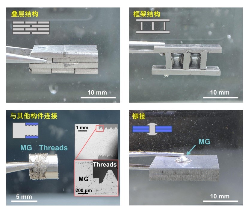 该研究还尝试了更复杂的焊接方式,并对金属材料在液体环境等极端条件下的制造成型进行了探索。此外,这种焊接方式被证明不仅仅局限于非晶合金与非晶合金的焊接,研究人员还利用非晶合金“低温软化”的特性连接其他材料,比如将非晶合金嵌入到其他构件、将非晶合金作为铆钉进行铆接等,具有良好的制造成型加工质量。