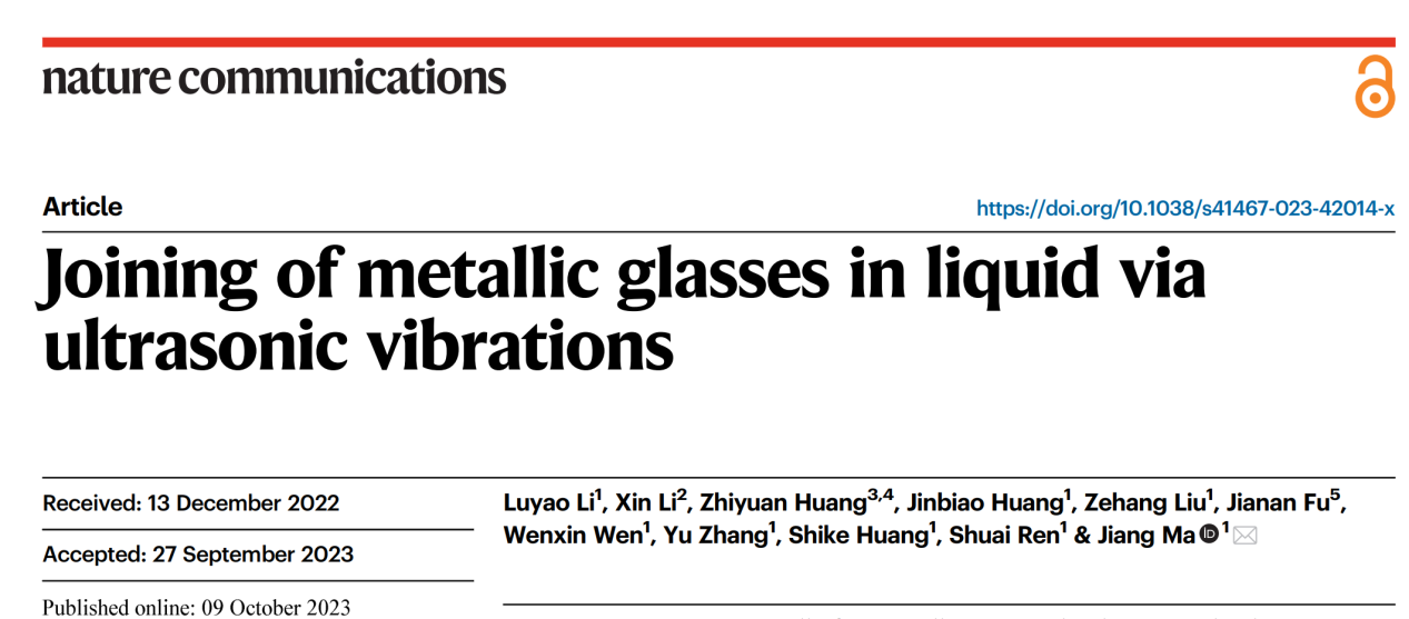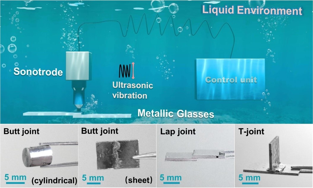 基于以上挑战,我院马将教授团队利用非晶合金这一金属材料独特的超声振动诱导塑性,开发出了一种新型的液体极端环境下金属材料高效焊接技术,成功地实现了金属材料(非晶合金)在水、海水、酒精以及液氮环境下的多种形式焊接。以上研究成果以“Joining of metallic glasses in liquid via ultrasonic vibrations”为题在知名学术期刊Nature Communications发表论文。其中,研究生李路遥为论文第一作者,马将教授为通讯作者。该工作获得了广东省基础与应用基础研究重大项目、国家自然科学基金委项目和国家重点研发计划项目的支持。