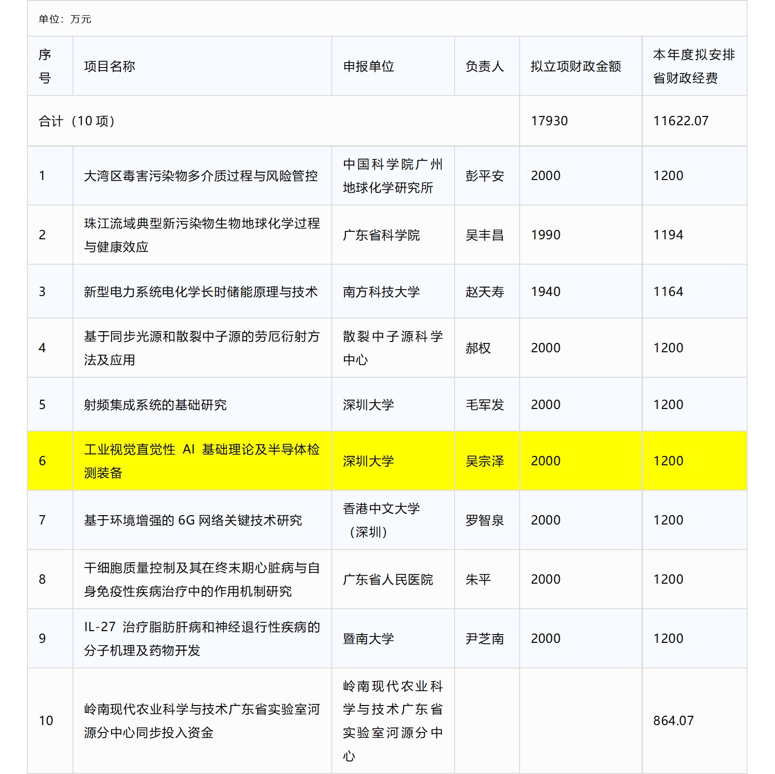 2023年11月30日至12月6日,广东省科学技术厅正式公示2023年度“领航”(原“旗舰”)类省基础与应用基础研究重大项目资金拟安排。深圳大学共获得两项省科技创新战略专项。其中毛军发校长团队的“射频集成系统的基础研究”项目获得2000万资金支持,我院吴宗泽院长团队的“工业视觉直觉性AI基础理论及半导体检测装备”项目获得2000万资金支持。该批次广东省科技创新战略专项在本年度拟安排省财政经费1200万元。