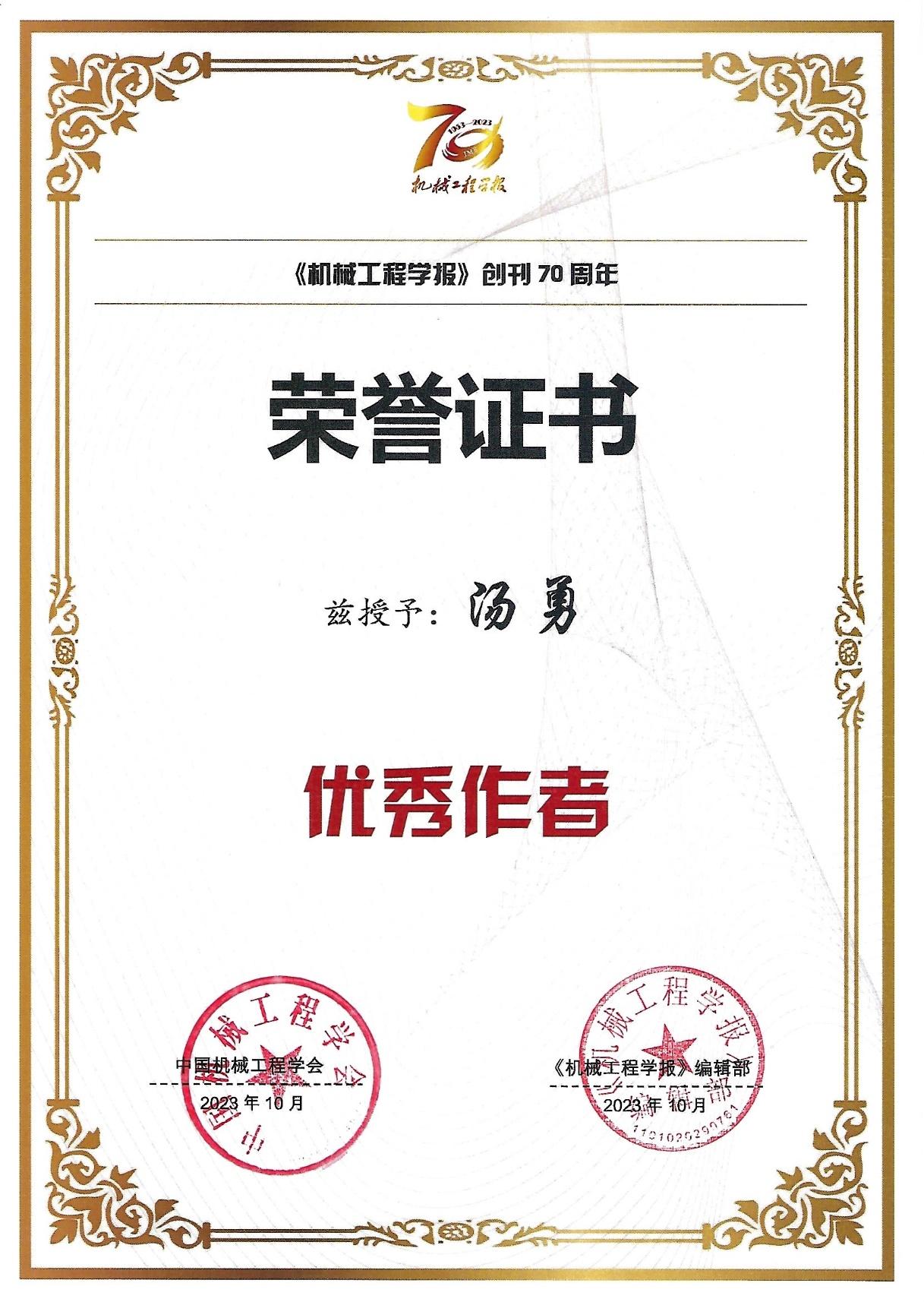 值此《机械工程学报》创刊70周年之际,为表彰近十年来在国内学术影响力高、在科技前沿有突破和建树、对原始创新有学术引领作用的优秀论文和优秀作者,评选委员会以论文的学术贡献为主要标准,综合考量学术影响力以及学科特点,经编辑部初筛、专家复选和评审委员会终审,最终评选出100篇优秀论文和100名优秀作者,其中我院汤勇教授入选《机械工程学报》优秀作者名单。截至目前,汤勇教授在《机械工程学报》共发表 19 篇论文,其中以第一作者/通讯作者发表论文 9 篇。