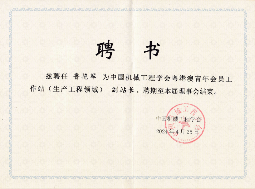 深圳大学机电与控制工程学院鲁艳军副教授作为协办单位负责人,作为大会组织委员会委员参与工作站站务工作,并被聘为中国机械工程学会粤港澳青年会员工作站(生产工程领域)副站长。
