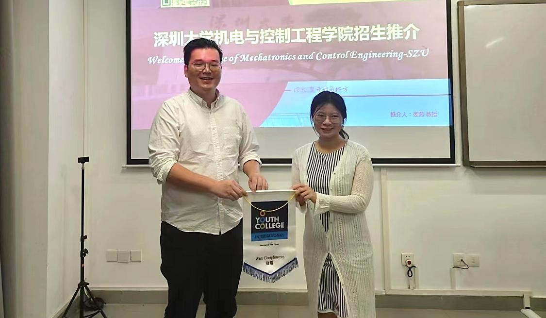 为促进大湾区香港与深圳两地学校的密切交流与合作,香港青年学院于5月17日组织师生团队,共计二十名学生和四名教师,前来机电与控制工程学院参观访问,推进与深圳大学工程学科的科技文化交流、激发学生面向工程学科领域的兴趣与深造愿景。机电与控制学院外事秘书洪岳老师与学院团委学生志愿服务队,于当天上午引导香港青年学院师生团参观了深圳大学南校区的教学楼群,之后在致理楼的多媒体教室向来访师生介绍了深圳大学历史概况、机电与控制工程学院的概况、院系特色、科研团队与招生推介等。宣传完毕,香港青年学院访问团队教师代表向机电与控制工程学院赠予了活动锦旗,增进两校两院交流情谊。