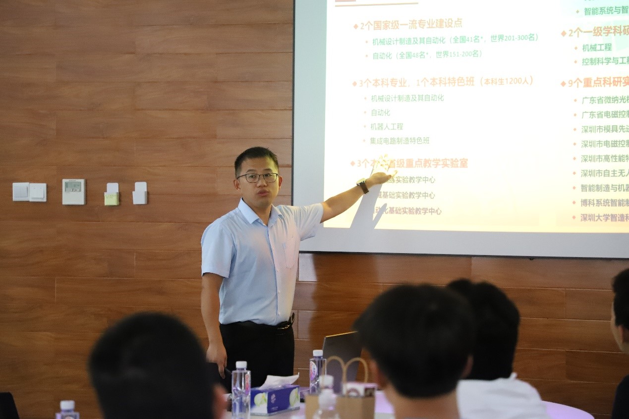 下午,参访队伍来到机电与控制工程学院,机械设计及其自动化专业副主任赵泽佳、学工办主任兼团委书记李伯威、工程训练中心与先进制造实训室副主任彭芳锡、Robotpilots 机器人俱乐部指导老师李漓等热情接待。李伯威首先对到访学生、家长及海浦蒙特工作人员表示欢迎,并结合精心制作的视频,介绍机电学院概况、学习生活和科创文化,展示奋楫前行的深大学生青春风采;赵泽佳从人才培养、科研成果、就业前景、录取情况等方面作机电与控制工程学院招生推介,欢迎在座学子报考深大并加入机电大家庭,勉励同学们“步履不停,终将遇见”,共同继承并发扬“精工践行,致臻如一”的工匠精神;彭芳锡向参访队伍介绍工程训练中心概况。实验室陈列柜上整齐摆放着各年级学生的创新实践作品和大型器械设备雕琢出的精细器件,吸引着学生们的目光,感受科技之美。