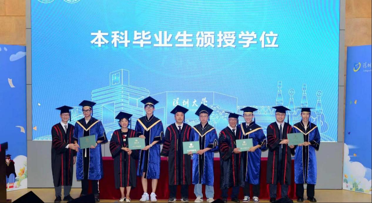 最后进行学位授予仪式,龚峰副院长宣读深圳大学关于授予学历教育博士学位的决定、深圳大学关于授予学历教育硕士学位的决定。娄燕副院长宣读深圳大学关于授予普通高等教育本科毕业生学士学位的决定。吴宗泽教授、龚峰教授、娄燕教授、钟小品副教授、马将教授、王序进教授、曲行达教授、汤勇教授、曹广忠教授、王华权老师、程蓉教授、张国庆副教授为博士、硕士和学士拨穗正冠,颁发学位证书。