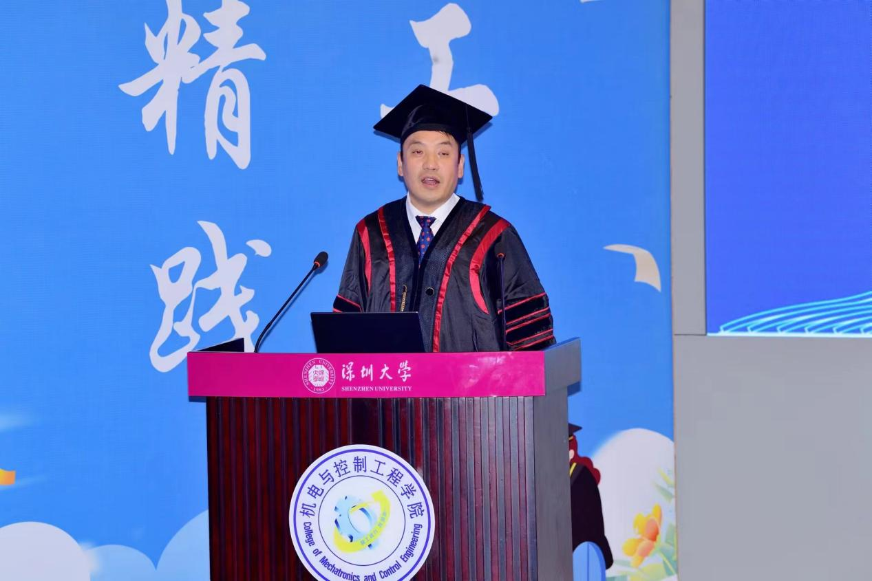 随后,机电与控制工程学院院长吴宗泽教授发表了深情寄语。他回顾了同学们在校期间的学习与生活点滴,送上“新时代”、“新起点”、“新未来”三个关键词,鼓励毕业生们紧跟时代的步伐,积极融入智能制造的浪潮中,不断提高自己的技术水平和创新能力,做时代的先锋;深入产业一线,坚持不懈地持续学习、大胆探索,肩负起“制造强国、智能兴邦”的重任;发扬好“自立、自律、自强”的校训三自精神,身体力行“精工践行、至臻如一”的院训工匠精神,不忘初心,砥砺前行,以昂扬的姿态和卓越的成就,书写属于自己的灿烂篇章。