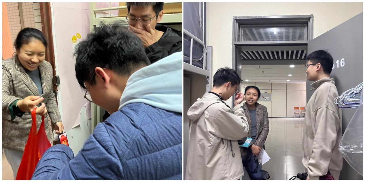 正值流感高峰期,学院党委副书记邓琳给在校同学带去了深大文创口罩等小礼品,提醒同学们注意身体锻炼和劳逸结合,遇到困难及时向学院和辅导员老师求助,并邀请同学们参加学校举办的元宵市集。在应届毕业生宿舍,党委主要领导关心询问同学们的升学情况和就业进展,鼓励同学们积极应对复杂激烈的就业形势,并树立“先就业后择业”的就业观念,逐步完成从大学生到社会人的过渡。