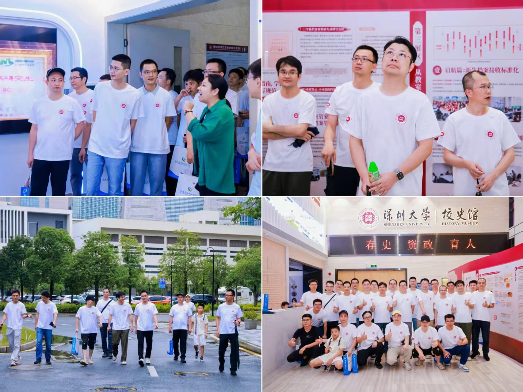 座谈会后,还安排了丰富的参观活动。校友们首先来到学院一楼智造长廊,近距离感受学院在智能制造领域的最新成果。随后,大家前往校史馆,重温深圳大学的发展历程,深刻体会到母校的深厚底蕴和文化传承。漫步校园途中,校友们不断寻觅旧踪影、发现新变化:波光潋滟的文山湖,新落成的“深大网红”致艺楼、见证沧海变桑田的北图书馆……每一步都伴随着“这里原来是……”“现在变得……”的惊叹与讨论。骤雨初歇,杜鹃山上郁郁葱葱,只是当年攀登的小径已修葺一新。大家用手机互相拍摄,记录下彼此在熟悉又陌生的校园背景下的笑脸。每一次驻足辨认,每一次发现新旧交织,都是一次对青春记忆的温柔触碰和对母校发展的由衷赞叹。
