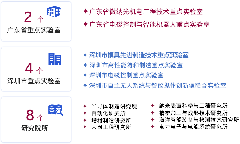 机电与控制工程学院建有2个广东省重点实验室、4个深圳市重点实验室、8个研究院所和17个校外研究生培养基地(1个国家级、11个省级),为培养高质量研究生提供了重要保障。