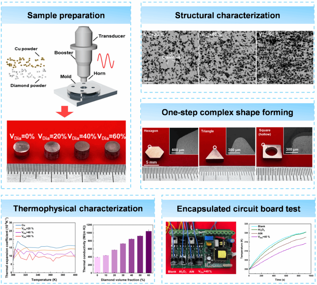 针对上述难点,深圳大学机电与控制工程学院马将教授团队提出了一种一步成型、无热源的冷制造方法,在室温和16MPa的低压下通过超声振动在几秒钟内制备了铜/金刚石复合材料。相比于常用的高温高压烧结(HTHP)方法,此方法压力降低200–500倍,温度仅为传统方法的20%。借助此技术,实现了铜颗粒界面之间的直接冶金结合和金刚石在铜基体中的固体嵌入,赋予复合材料150MPa的高屈服强度和超过1043W/(mK)的高热导率。此外,通过该方法可以很容易制造出不同复杂形状的铜/金刚石复合材料。散热应用测试表明,其热管理性能优于商用的Al2O3和AlN材料。