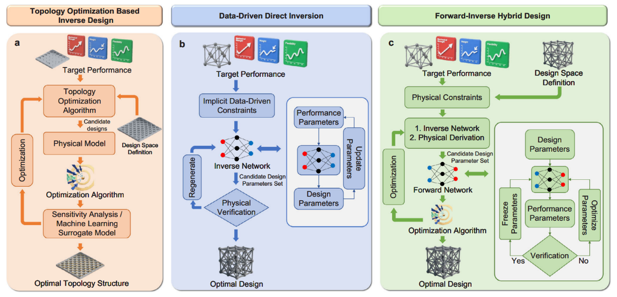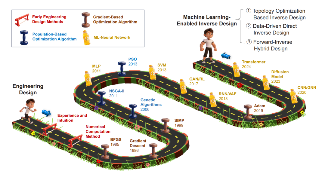 图2:工程领域逆向设计的发展历程,从最初的试错法到现今三种基于机器学习的逆向设计方法