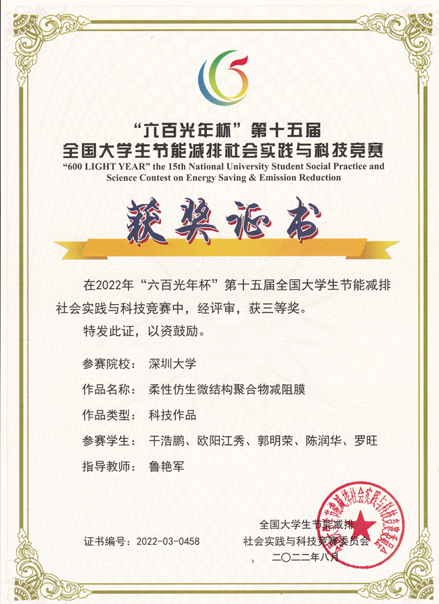 由机电与控制工程学院鲁艳军老师指导,干浩鹏、欧阳江秀、郭明荣、陈润华、罗旺等5位同学组成的代表团队充分备赛,作品《柔性仿生微结构聚合物减阻膜》获得全国三等奖的优异成绩!