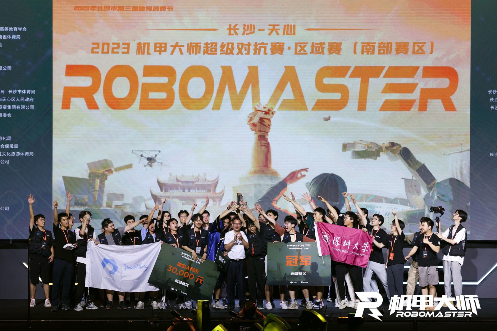 5月25-28日,第二十二届全国大学生机器人大赛RoboMaster2023机甲大师超级对抗赛·区域赛(南部赛区)在长沙贺龙体育馆火热进行。经过数天的激烈角逐,深圳大学RobotPilots战队在南部32支队伍中脱颖而出,以第一名的成绩从小组赛中晋级,并在淘汰赛和八进四比赛中分别击败佛山科学技术学院、华南农业大学,以全胜战绩进入半决赛。5月28日半决赛2:0打败西安交通大学,成功进入冠军争夺赛。决赛最终以3:1的成绩打败对手大连交通大学,夺下本次南部区域赛冠军!