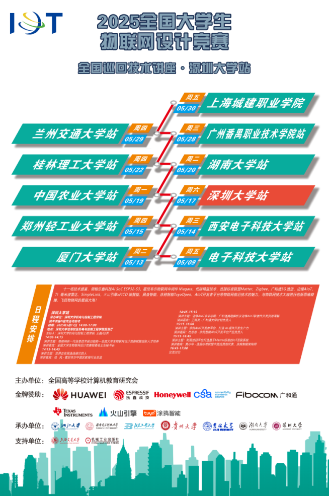 2025年全国大学生物联网设计竞赛全国巡回技术讲座深圳大学站,欢迎全校师生扫码报名参加本站活动,与物联网技术大咖面对面进行创新思维碰撞,领略霍尼韦尔物联网中间件 Niagara、低碳精益技术,广和通 5G 通信、边缘 AIoT,涂鸦智能 TuyaOpen、AIoT 开发者平台,连接标准联盟 Matter、Zigbee 等物联网前沿技术的魅力,聆听赛题解析,深入探讨与竞赛合作企业在课程建设、实践教学、人才培养等方面合作。