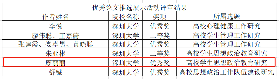 近日,由高校思想政治工作队伍培训研修中心(华南师范大学)组织开展的2023年广东高校思想政治工作优秀论文和优秀案例推选展示活动评选结果揭晓,我院学工团队喜获佳绩。其中,邓琳老师和黄浩老师撰写的案例《邻里思政:以品牌项目创建夯实学生社区协同育人》获得优秀案例推选展示一等奖;廖丽丽老师撰写的论文《习近平总书记关于青年奋斗重要论述的方法论》获得优秀论文推选展示优秀奖。