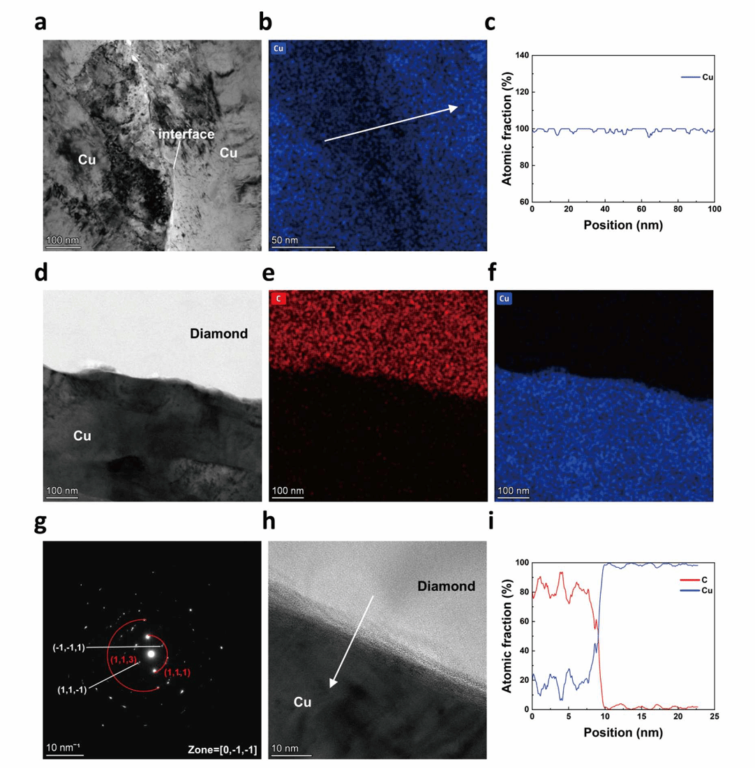 针对上述难点,深圳大学机电与控制工程学院马将教授团队提出了一种一步成型、无热源的冷制造方法,在室温和16MPa的低压下通过超声振动在几秒钟内制备了铜/金刚石复合材料。相比于常用的高温高压烧结(HTHP)方法,此方法压力降低200–500倍,温度仅为传统方法的20%。借助此技术,实现了铜颗粒界面之间的直接冶金结合和金刚石在铜基体中的固体嵌入,赋予复合材料150MPa的高屈服强度和超过1043W/(mK)的高热导率。此外,通过该方法可以很容易制造出不同复杂形状的铜/金刚石复合材料。散热应用测试表明,其热管理性能优于商用的Al2O3和AlN材料。