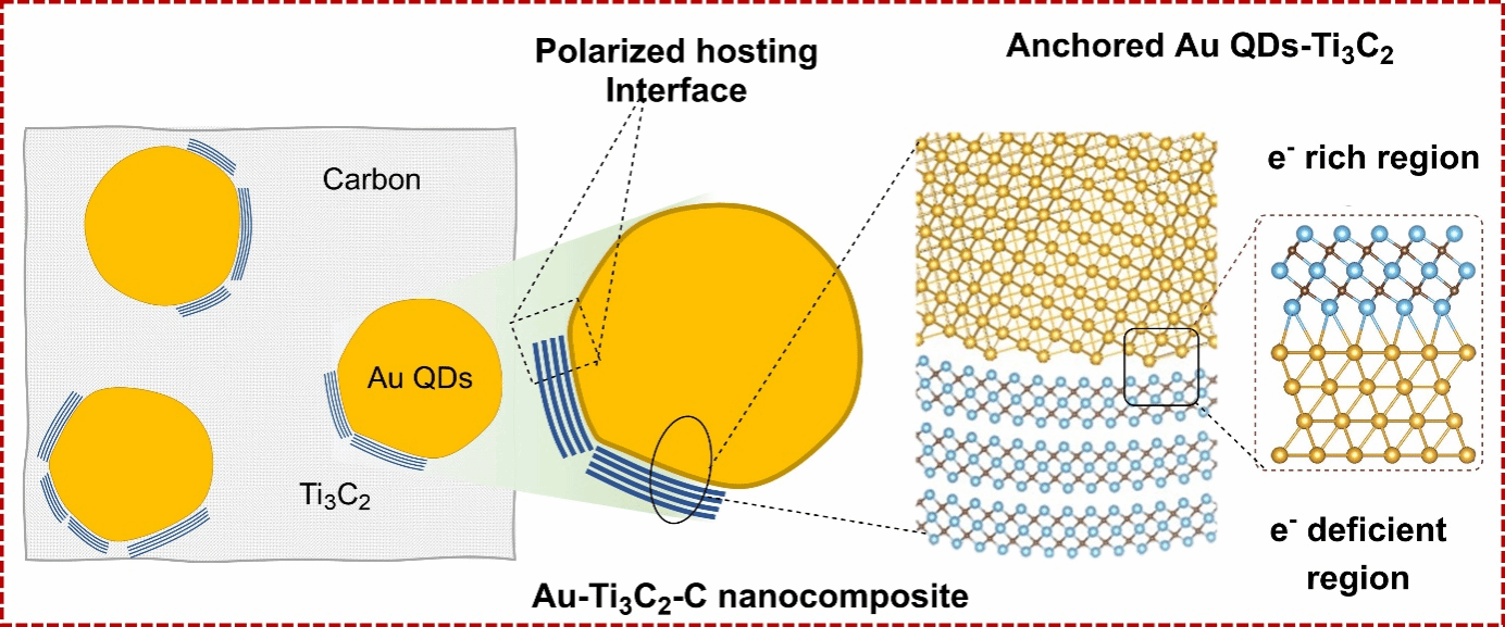 (1) Construction of a polarized host interface to break through the lithium adsorption and transport bottleneck: By utilizing the work function difference between Au QDs and Ti₃C₂Tₓ to form a polarized interface, electron-deficient nanobags are induced, significantly improving lithium adsorption and charge/ion transport efficiency.