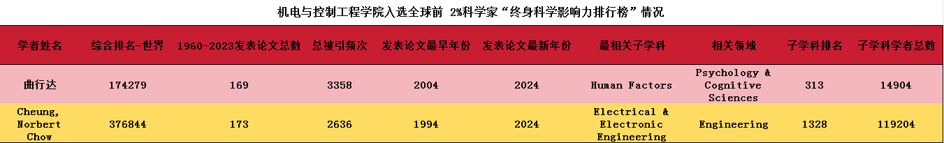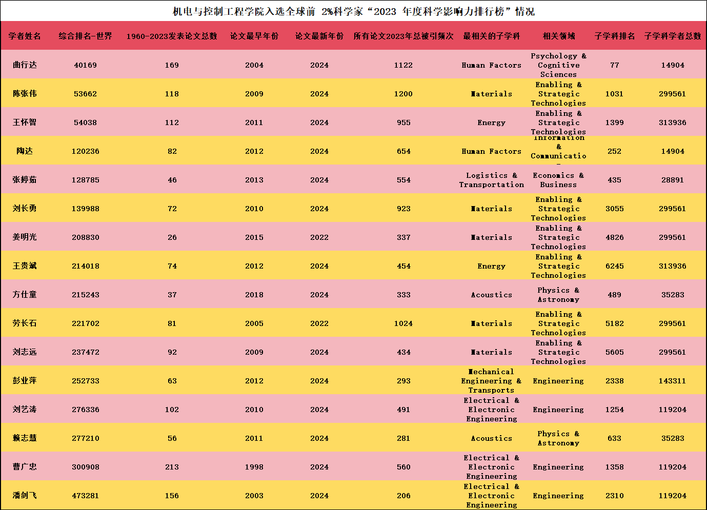 根据榜单数据,机电与控制工程学院共有17名学者成功入选全球前2%顶尖科学家榜单,其中2名学者入选“终身科学影响力排行榜”,16名学者入选“2023年度科学影响力排行榜”。值得一提的是,我院曲行达教授凭借其在科研领域的杰出贡献和卓越成就,同时入选“终身科学影响力排行榜”和“2023年度科学影响力排行榜”。相较于去年的排行榜,学院入选“终身科学影响力排行榜”学者数量增加1名,入选“2023年度科学影响力排行榜”的学者增加了4名,详细的我院“终身科学影响力排行榜”和“2023年度科学影响力排行榜”学者名单见下图。