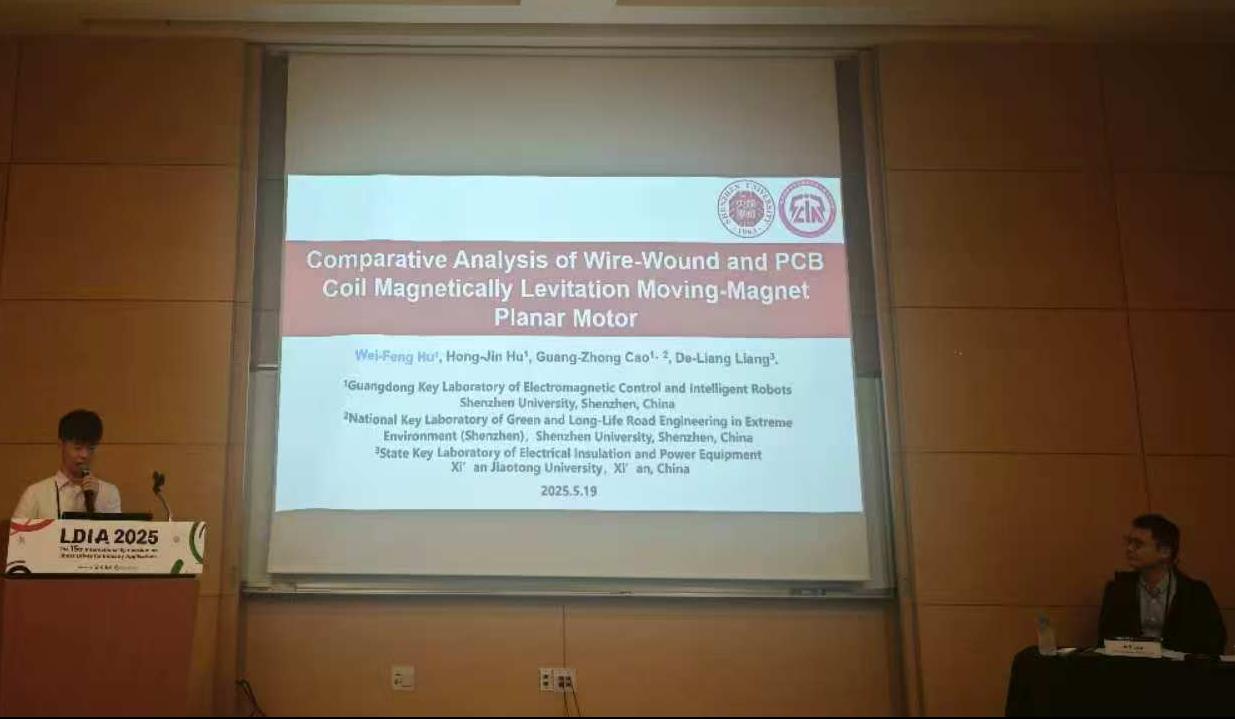 胡威峰同学报告的论文题目是:Comparative Analysis of Wire-Wound and PCB Coil Magnetically Levitation Moving-Magnet Planar Motor。论文创新性地研究并比较了绕线式和PCB线圈式动磁型磁浮平面电机的特性,为发展磁浮平面电机提供了有价值的基础指导。胡威峰同学为论文第一作者,胡宏锦助理教授为论文通讯作者,曹广忠教授为胡威峰同学导师。该论文工作受国家自然科学基金原创项目(52450311)、面上项目(52277061)等项目资助。