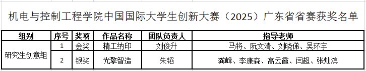 在2025年中国国际大学生创新大赛广东省决赛中,我院学子表现出色,凭借扎实的专业知识、突出的创新能力和默契的团队协作,斩获1金1银的优异成绩。其中,“精工纳印”项目荣获研究生创意组金奖,“光擎制造”项目获得研究生创意组银奖。
