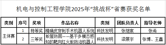 在被誉为当代大学生学术科技“奥林匹克”的“挑战杯”广东大学生课外学术科技作品竞赛终审决赛中,机电学子精心准备、奋勇争先,最终,我院参赛作品--精确皮穿刺手术机器人系统,在众多优秀项目中脱颖而出,一举夺得主体赛特等奖!蚁屋防固--基于多模态感知的靶向红火蚁防治机器人项目则斩获赛事三等奖。