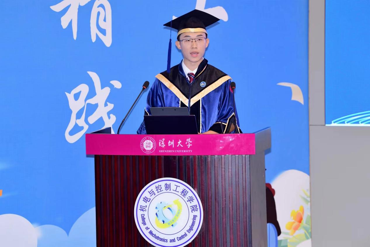 随后,机电与控制工程学院院长吴宗泽教授发表了深情寄语。他回顾了同学们在校期间的学习与生活点滴,送上“新时代”、“新起点”、“新未来”三个关键词,鼓励毕业生们紧跟时代的步伐,积极融入智能制造的浪潮中,不断提高自己的技术水平和创新能力,做时代的先锋;深入产业一线,坚持不懈地持续学习、大胆探索,肩负起“制造强国、智能兴邦”的重任;发扬好“自立、自律、自强”的校训三自精神,身体力行“精工践行、至臻如一”的院训工匠精神,不忘初心,砥砺前行,以昂扬的姿态和卓越的成就,书写属于自己的灿烂篇章。