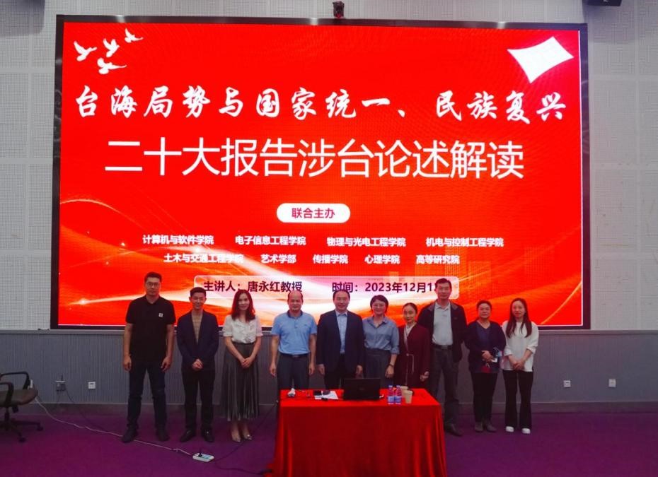 12月12日,厦门大学台湾研究院教授、博士生导师唐永红教授应深圳大学计算机与软件学院党委邀请,于深圳大学粤海校区南区致腾楼一楼报告厅开展“台海局势与国家统一、民族复兴——二十大报告涉台论述解读”的专题讲座,讲座由计算机与软件学院党委、电子信息工程学院党委、物理与光电工程学院党委、机电与控制工程学院党委、土木与交通工程学院党委、艺术学部党委、传播学院党委、心理学院党委、高等研究院党委联合举办。计算机与软件学院党委书记杨国洪主持会议,电子信息工程学院党委书记周浩江、机电与控制工程学院党委书记郑纯、土木与交通工程学院党委书记左英姿、艺术学部党委书记张剑滨、物理与光电工程学院党委副书记龙晓丽、高等研究院党委书记邱妙芳、传播学院党委副书记陈一鸣、心理学院党委副书记高亮及300余名学生党员参加了本次讲座。